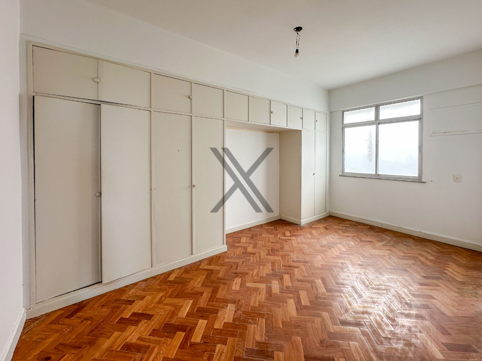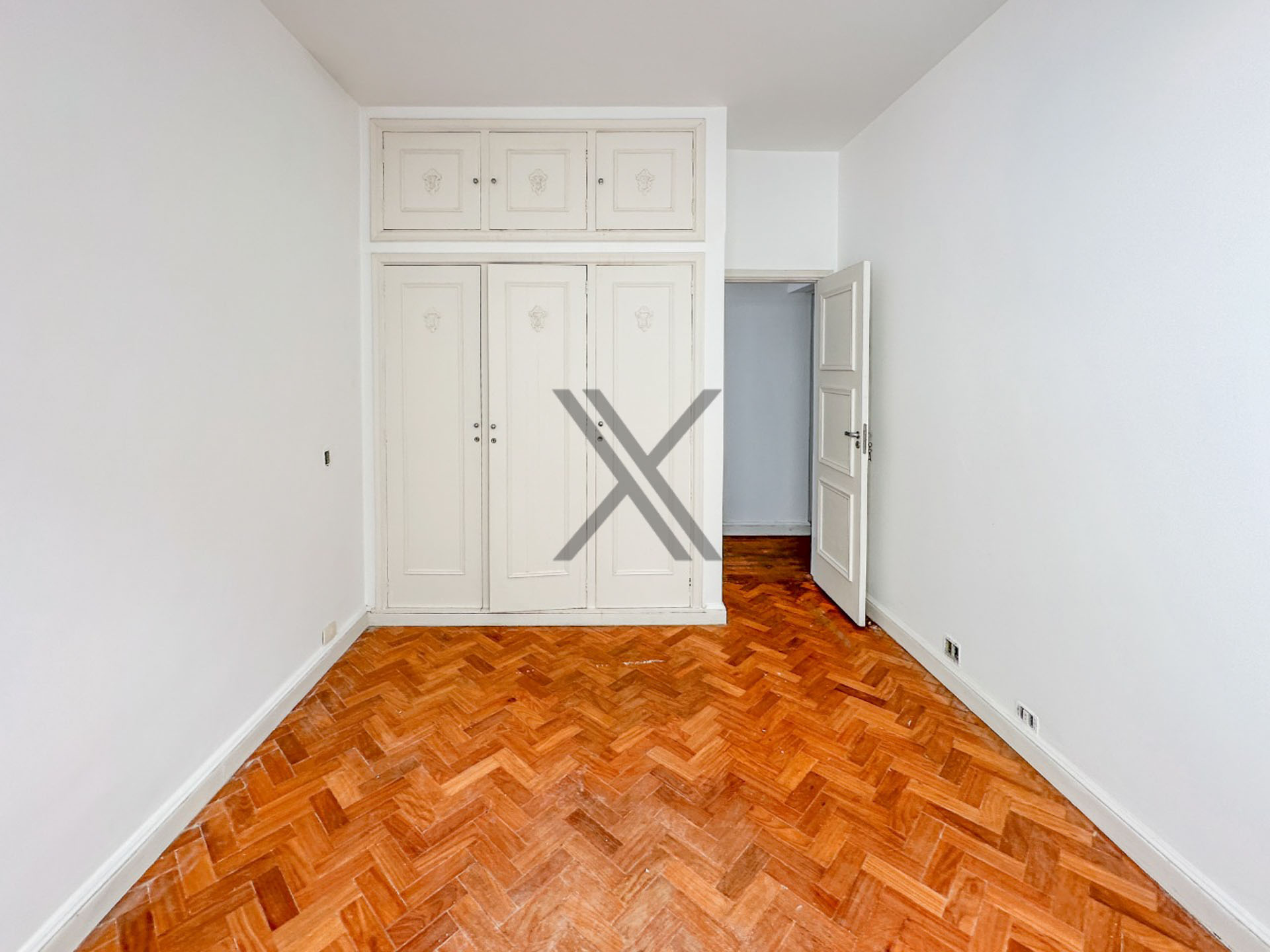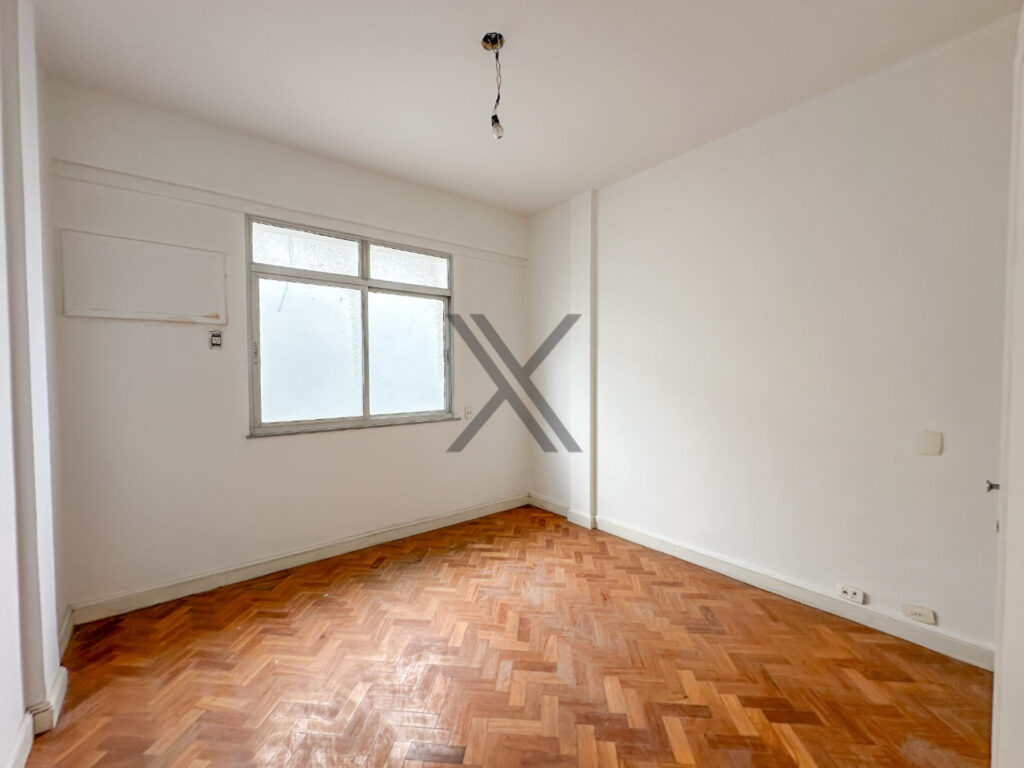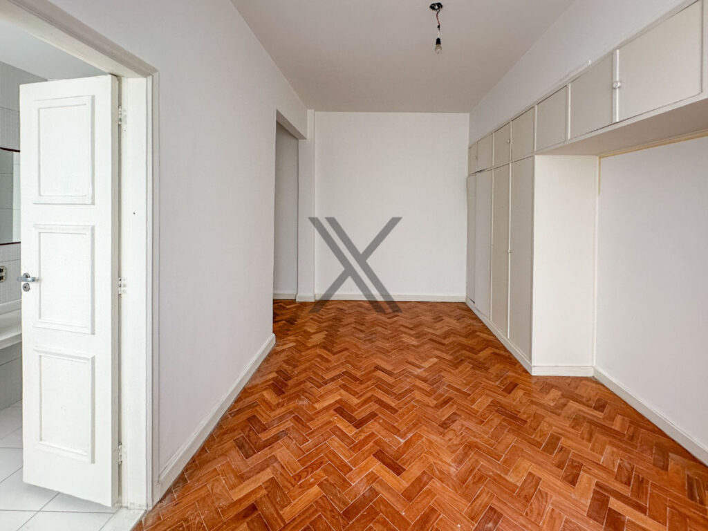 A parte privativa é composta por 3 quartos, sendo 1 suíte, todos com boa metragem, armários e a mesma farta luz natural e vista lateral mar. Um banheiro social de apoio aos quartos e à sala complementa o ambiente. O piso original em madeira está em ótimo estado, realçando as características clássicas deste belo apartamento.